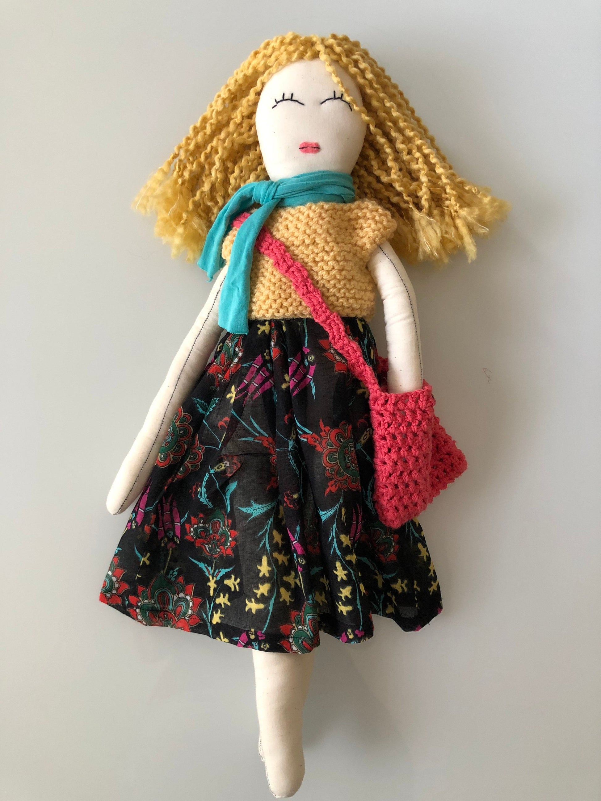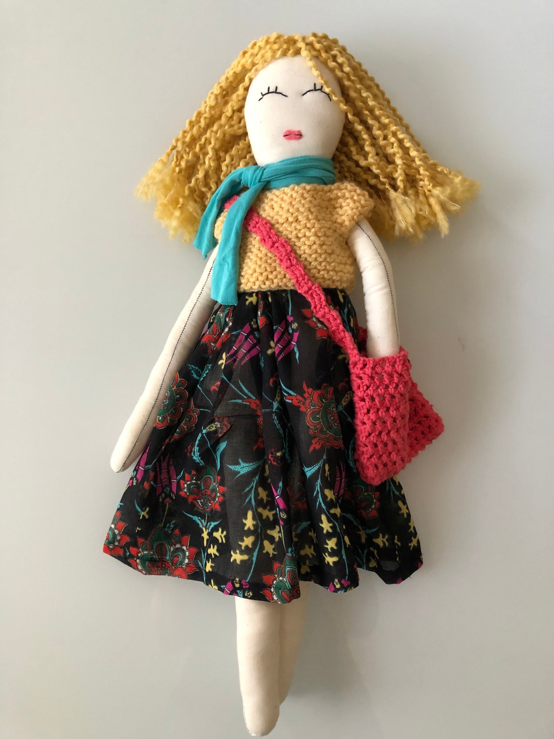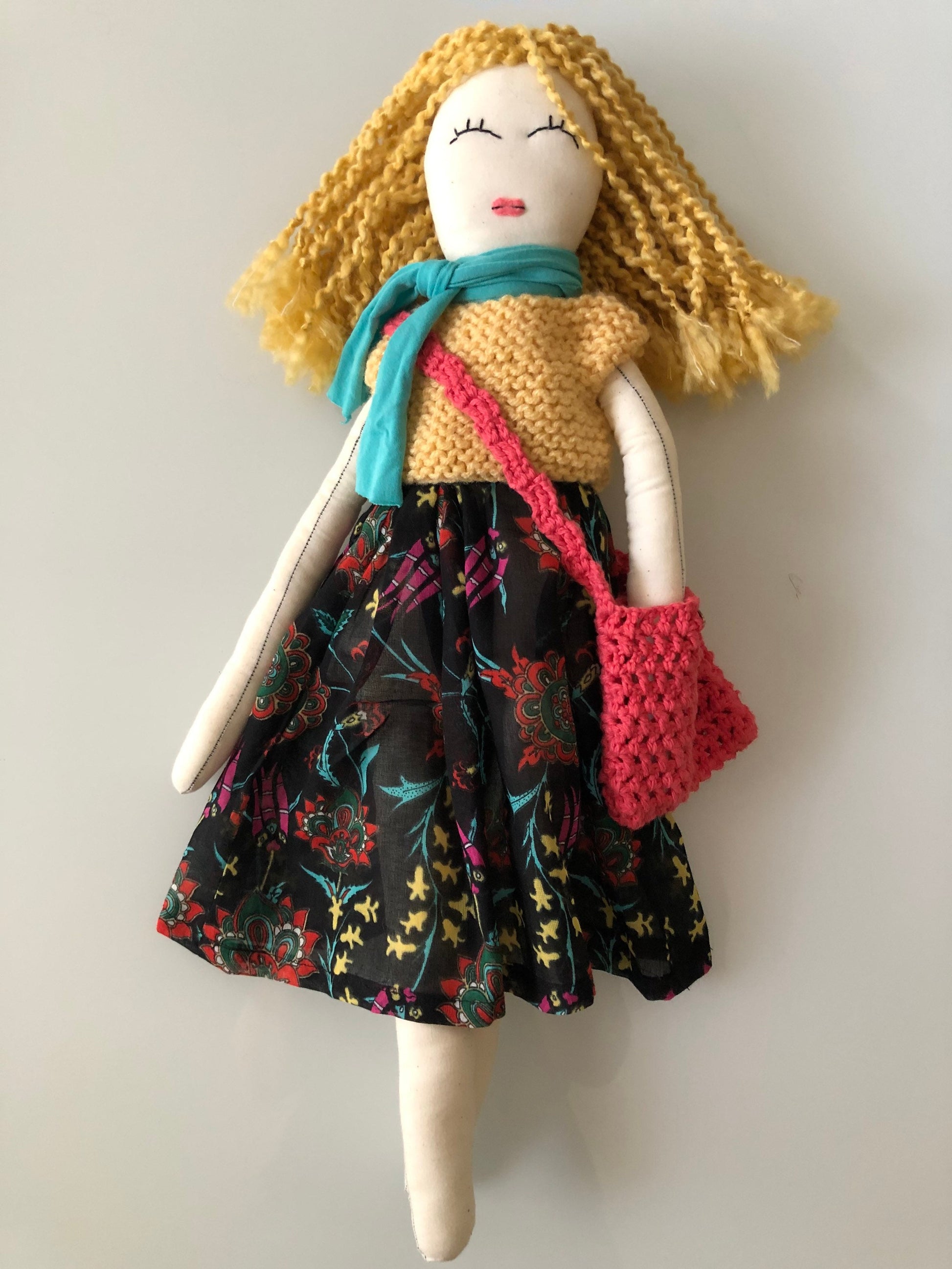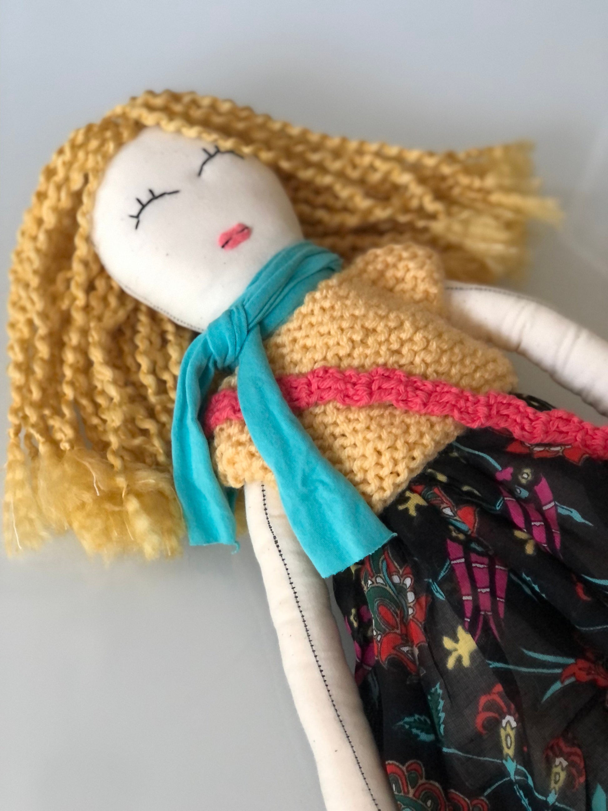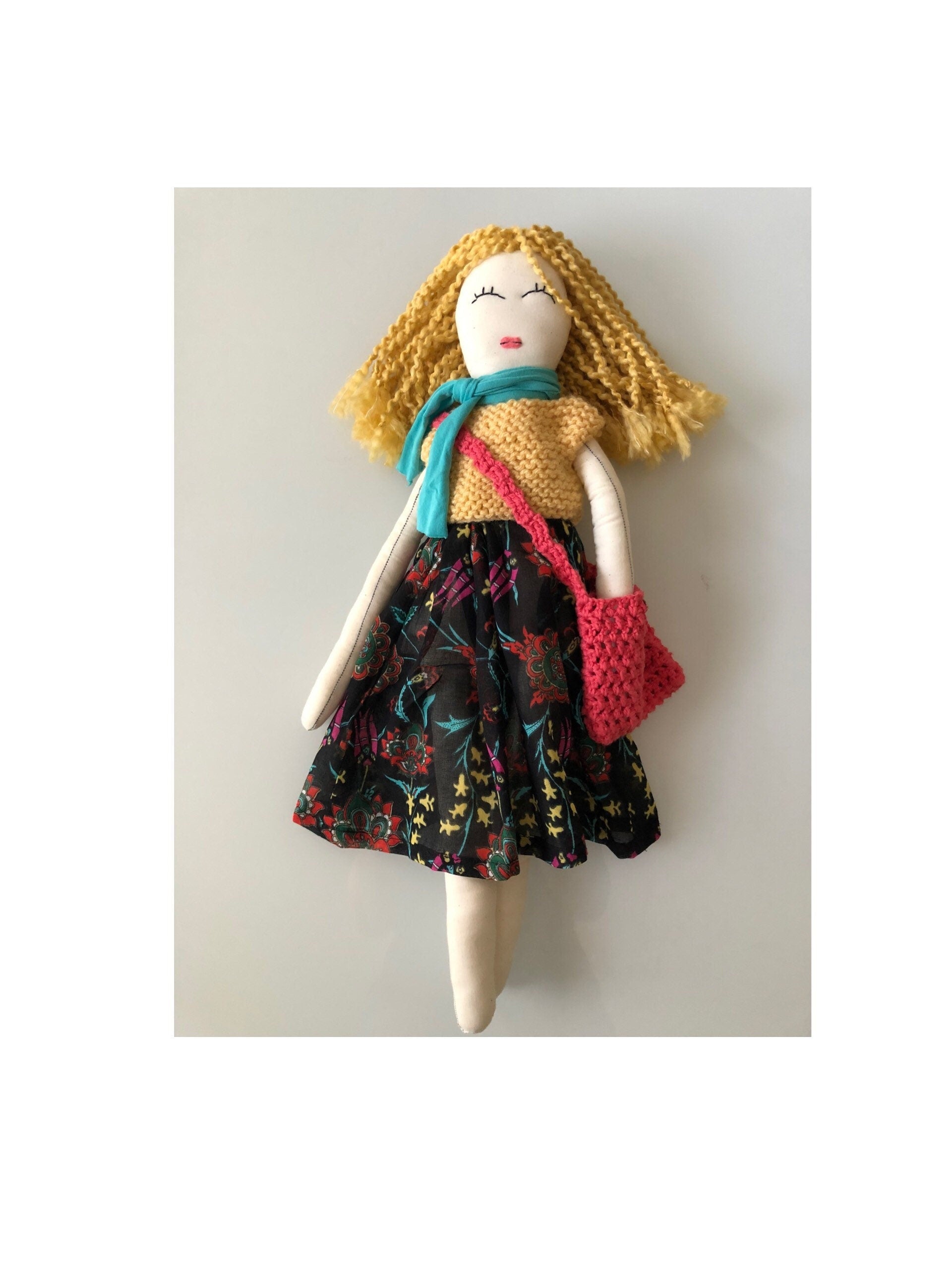 She stands tall and proud at approximately 22 inches tall. Her body is fully 100% cotton fabric, muslin, or linen. She is carefully constructed with her seams double stitched. All materials used in her construction have been carefully sourced and selected from the best and the finest. Her eyes have been free-hand embroidered, which gives every twinkle in every doll's eyes an individual uniqueness. Each doll is stuffed with sustainable corn fiber stuffing. Her hair is mostly 100% wool, cotton, mohair, or acrylic mix yarn. Her arms are attached with handmade crochet motifs, therefore making her arms buttonless jointed. She is recommended as an heirloom doll, for gentle play only for children over the age of three with adult supervision due to the inclusion of small parts. Most importantly, she comes filled with lots of love and joy! 22 inches Rag Doll, First birthday Gift for Little Girls, Nursery Room Decor!