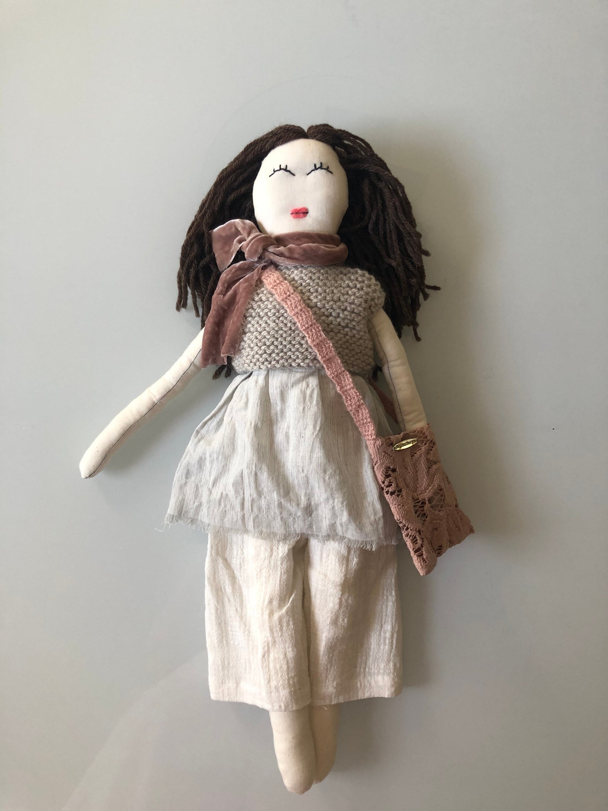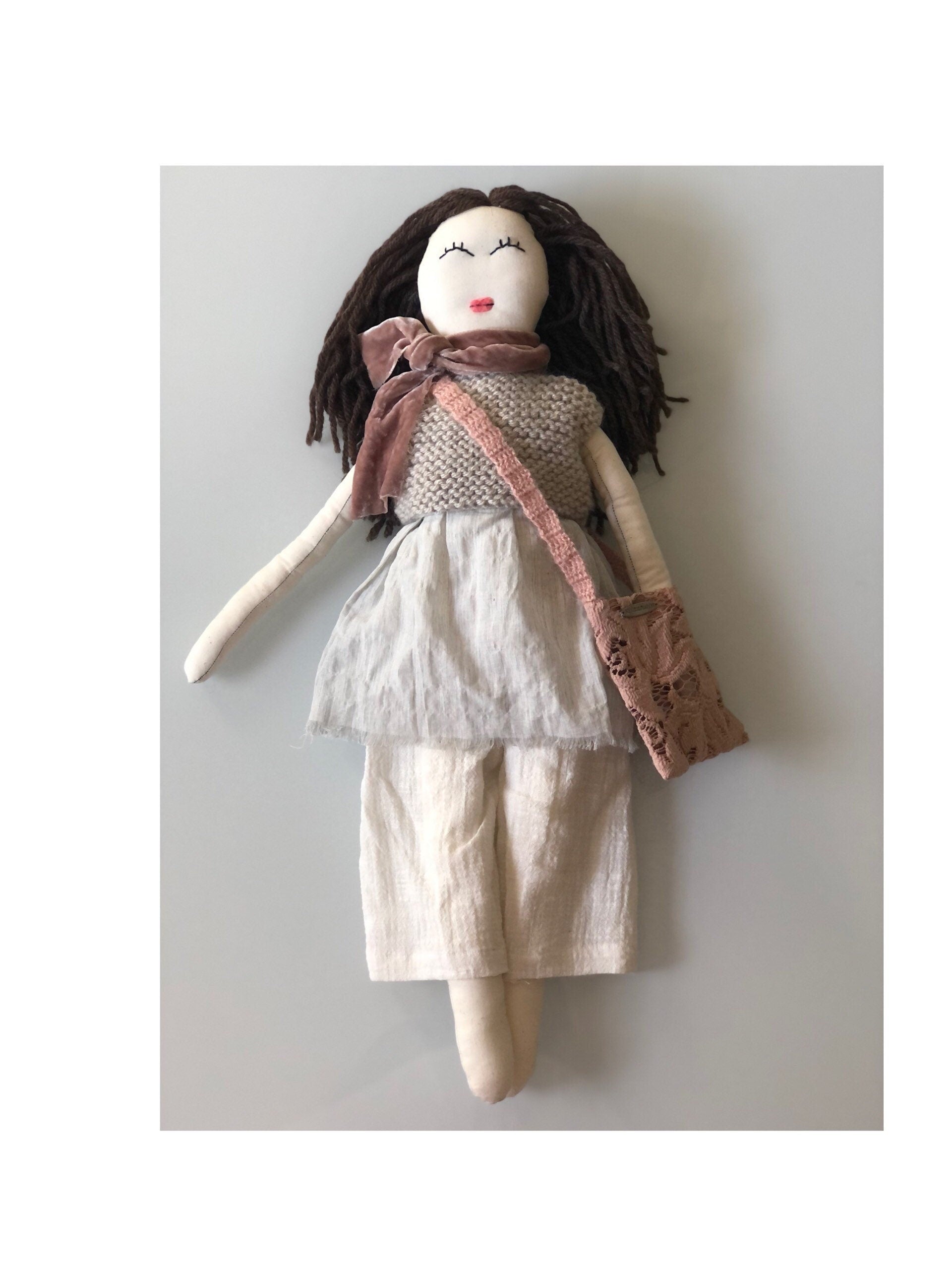 She stands tall and proud at approximately 22 inches tall. Her body is fully 100% cotton fabric, muslin, or linen. She is carefully constructed with her seams double stitched. All materials used in her construction have been carefully sourced and selected from the best and the finest. Her eyes have been free-hand embroidered, which gives every twinkle in every doll's eyes an individual uniqueness. Each doll is stuffed with sustainable corn fiber stuffing. Her hair is mostly 100% wool, cotton, mohair, or acrylic mix yarn. Her arms are attached with handmade crochet motifs, therefore making her arms buttonless jointed. She is recommended as an heirloom doll, for gentle play only for children over the age of three with adult supervision due to the inclusion of small parts. Most importantly, she comes filled with lots of love and joy!