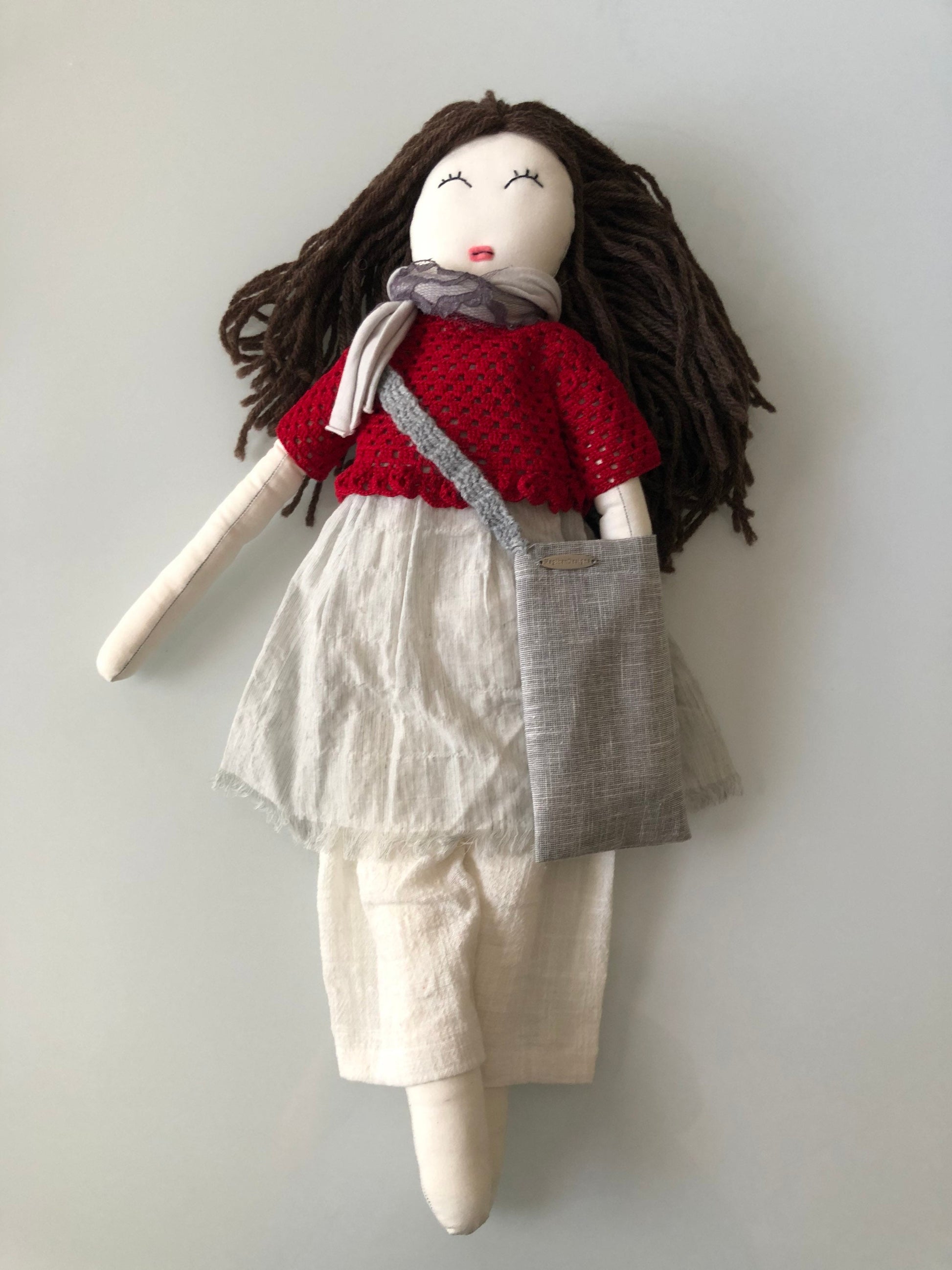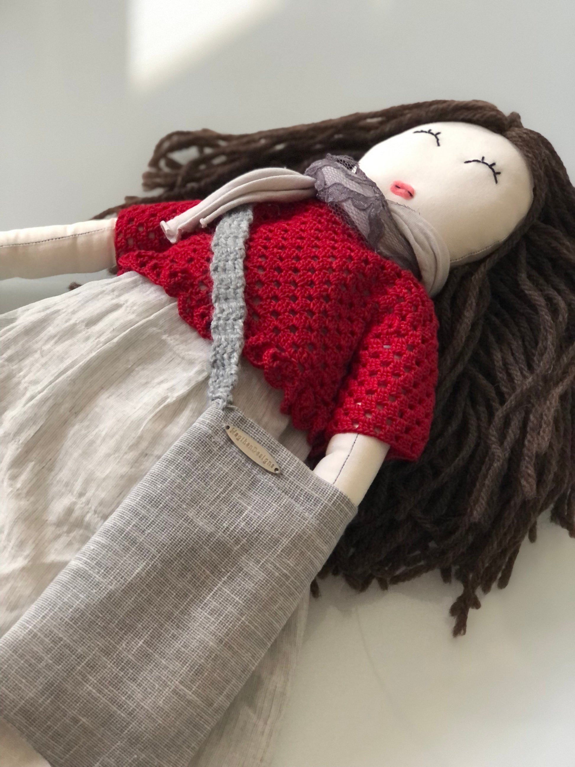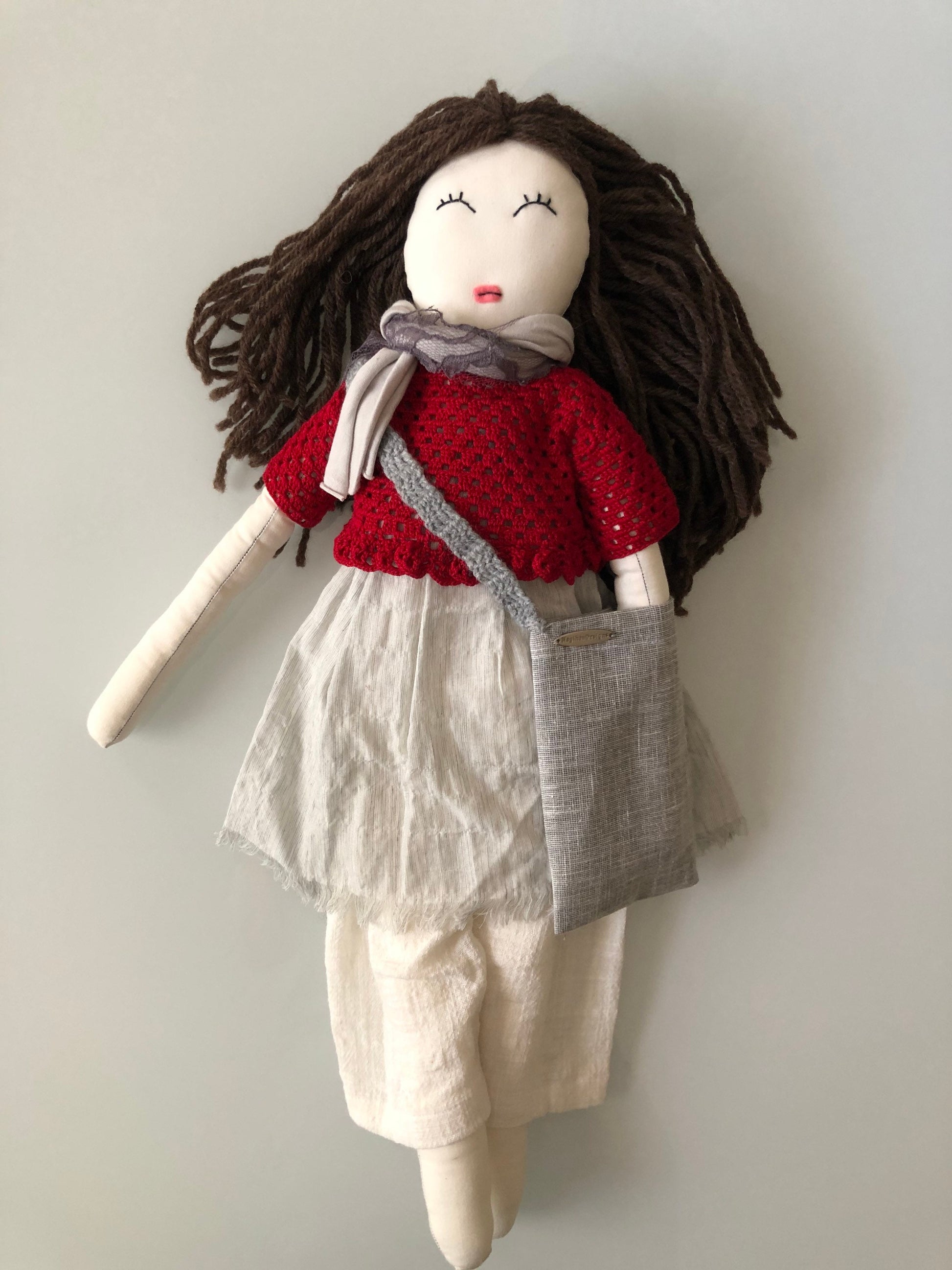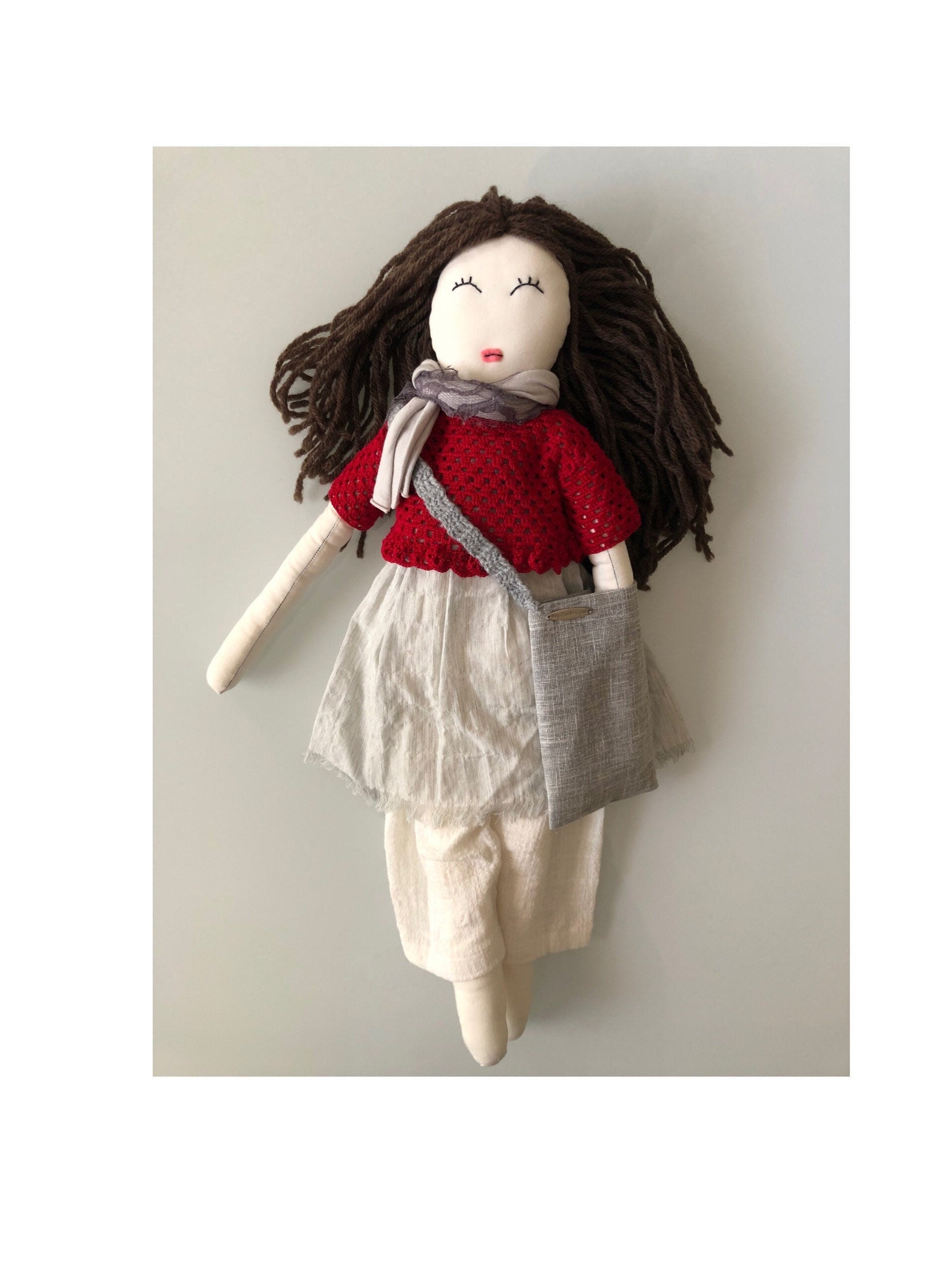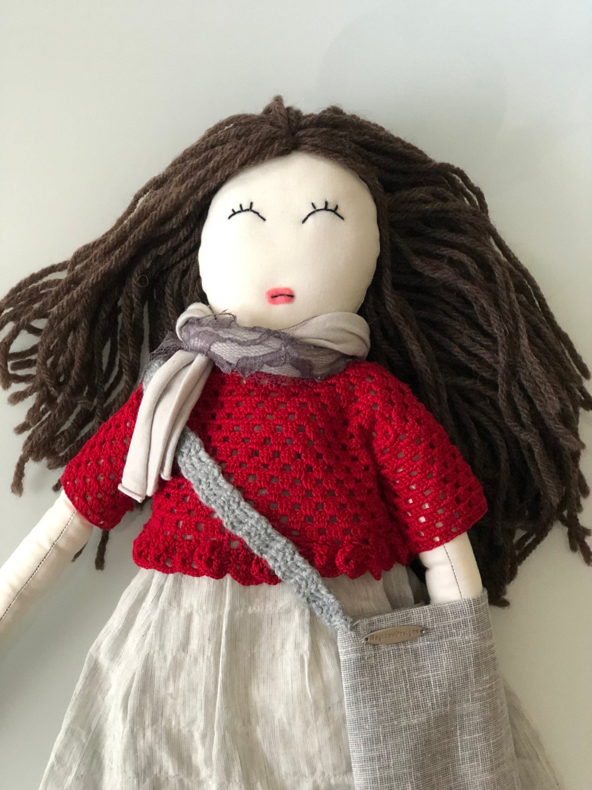 She stands tall and proud at approximately 22 inches tall. Her body is fully 100% cotton fabric, muslin, or linen. She is carefully constructed with her seams double stitched. All materials used in her construction have been carefully sourced and selected from the best and the finest. Her eyes have been free-hand embroidered, which gives every twinkle in every doll's eyes an individual uniqueness. Each doll is stuffed with sustainable corn fiber stuffing. Her hair is mostly 100% wool, cotton, mohair, or acrylic mix yarn. Her arms are attached with handmade crochet motifs, therefore making her arms buttonless jointed. She is recommended as an heirloom doll, for gentle play only for children over the age of three with adult supervision due to the inclusion of small parts. Most importantly, she comes filled with lots of love and joy!