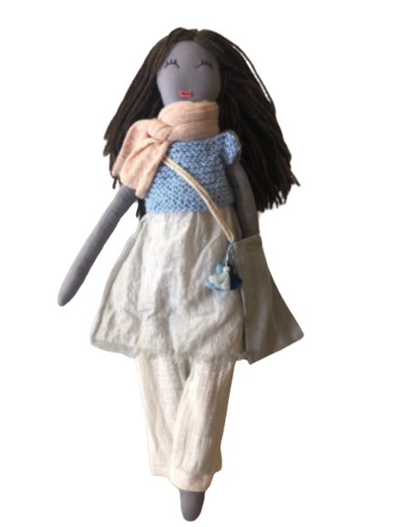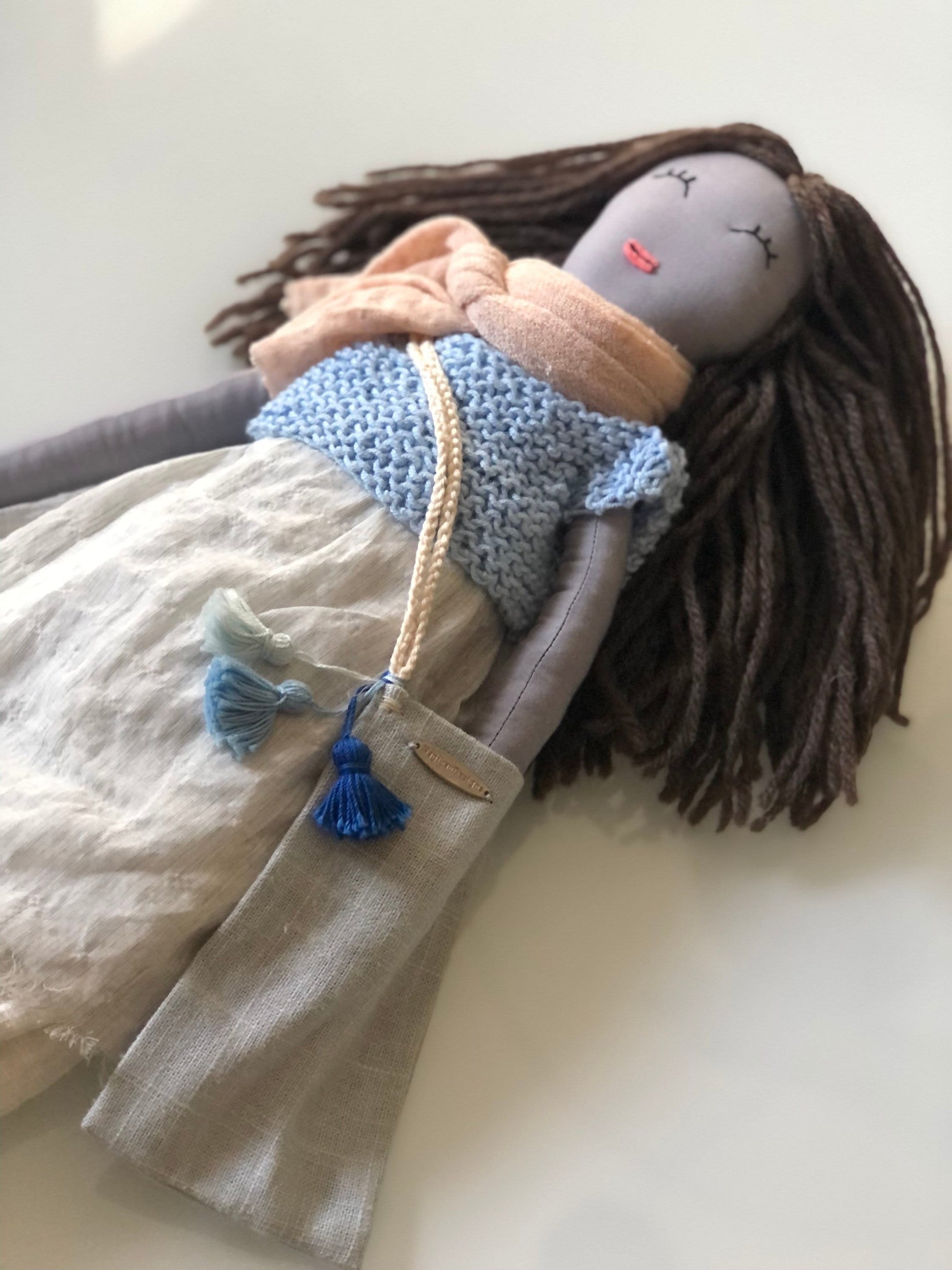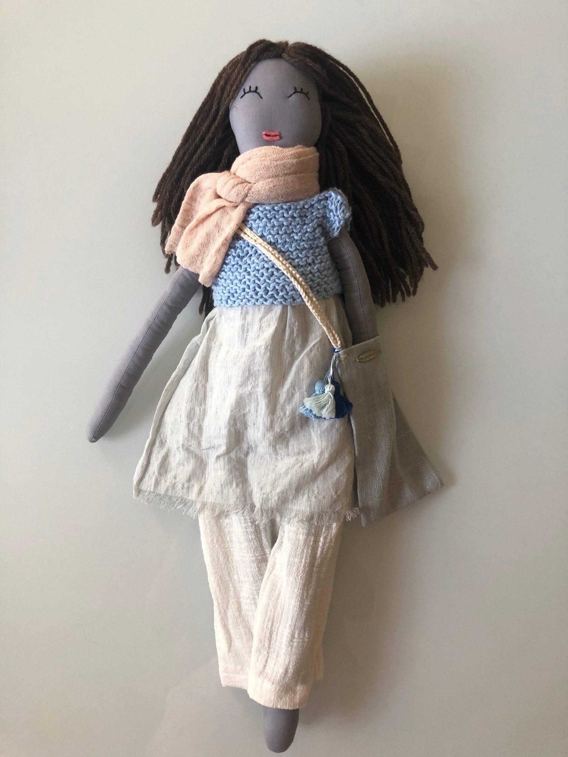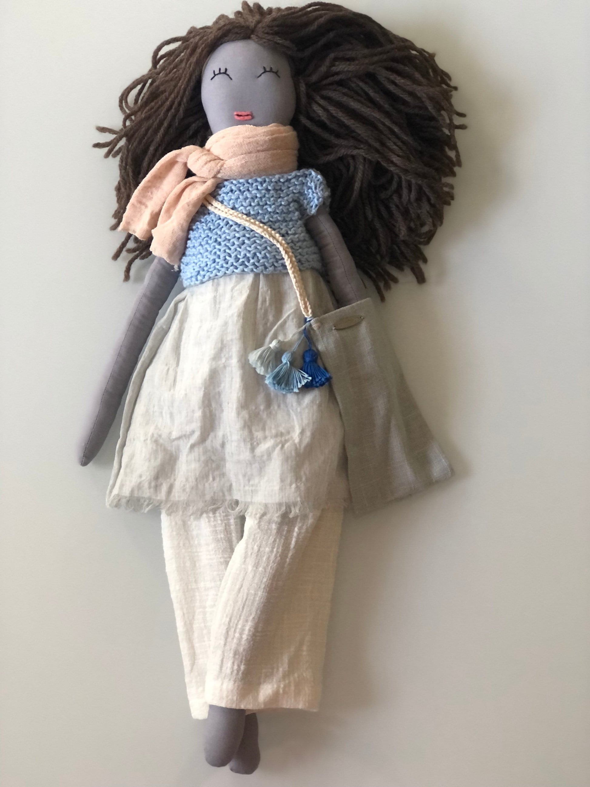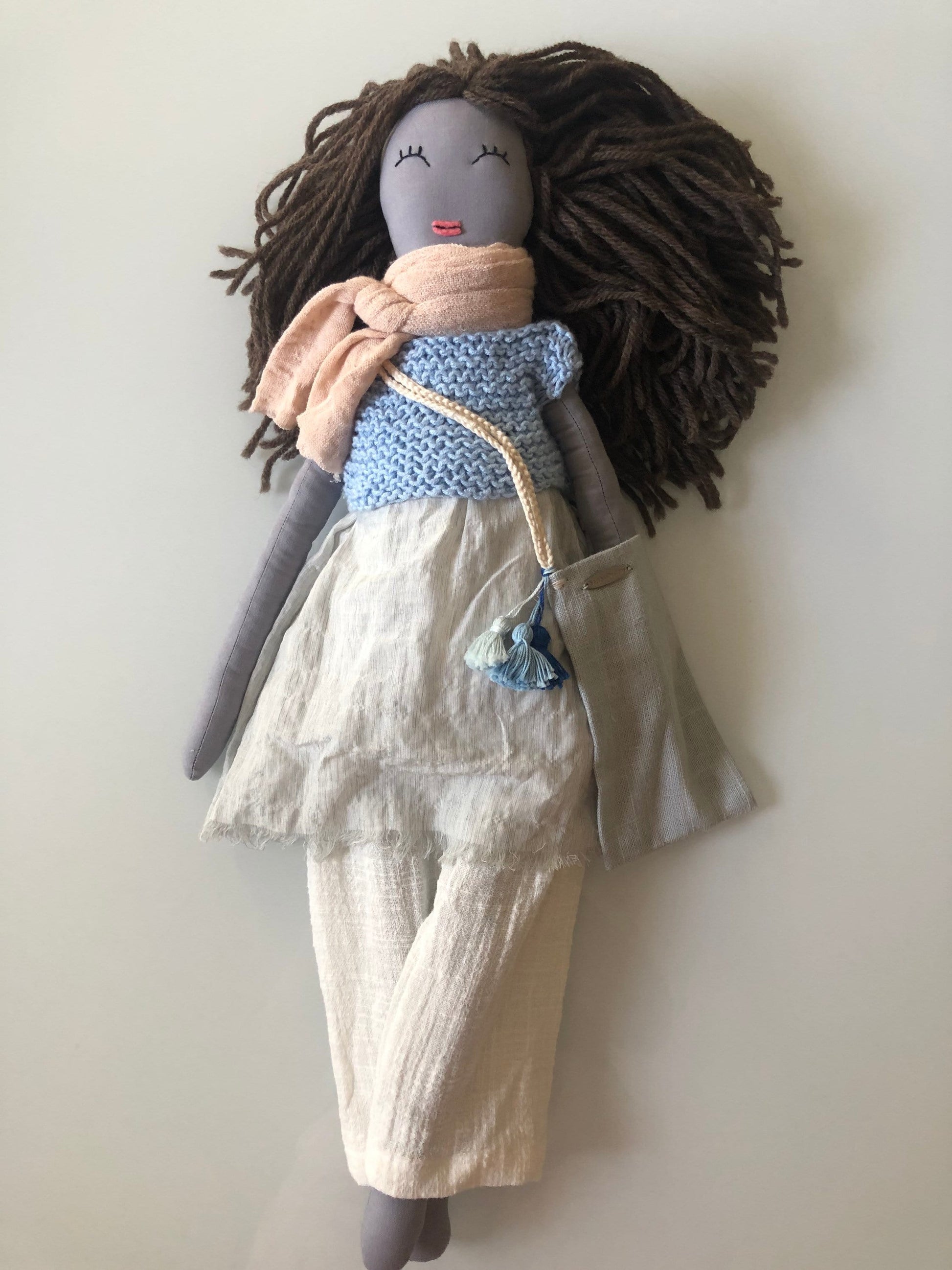 She stands tall and proud at approximately 22 inches tall. Her body is fully 100% cotton fabric, muslin, or linen. She is carefully constructed with her seams double stitched. All materials used in her construction have been carefully sourced and selected from the best and the finest. Her eyes have been free-hand embroidered, which gives every twinkle in every doll's eyes an individual uniqueness. Each doll is stuffed with sustainable corn fiber stuffing. Her hair is mostly 100% wool, cotton, mohair, or acrylic mix yarn. Her arms are attached with handmade crochet motifs, therefore making her arms buttonless jointed. She is recommended as an heirloom doll, for gentle play only for children over the age of three with adult supervision due to the inclusion of small parts. Most importantly, she comes filled with lots of love and joy!