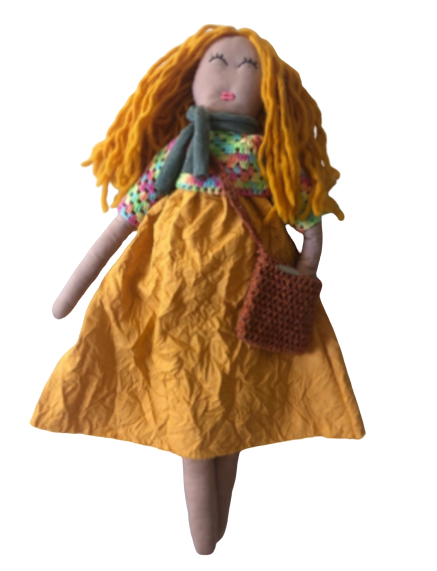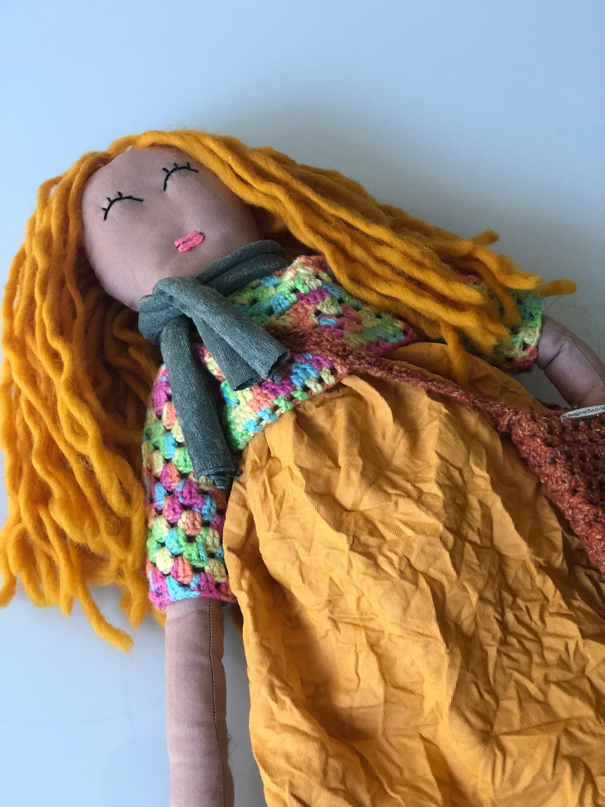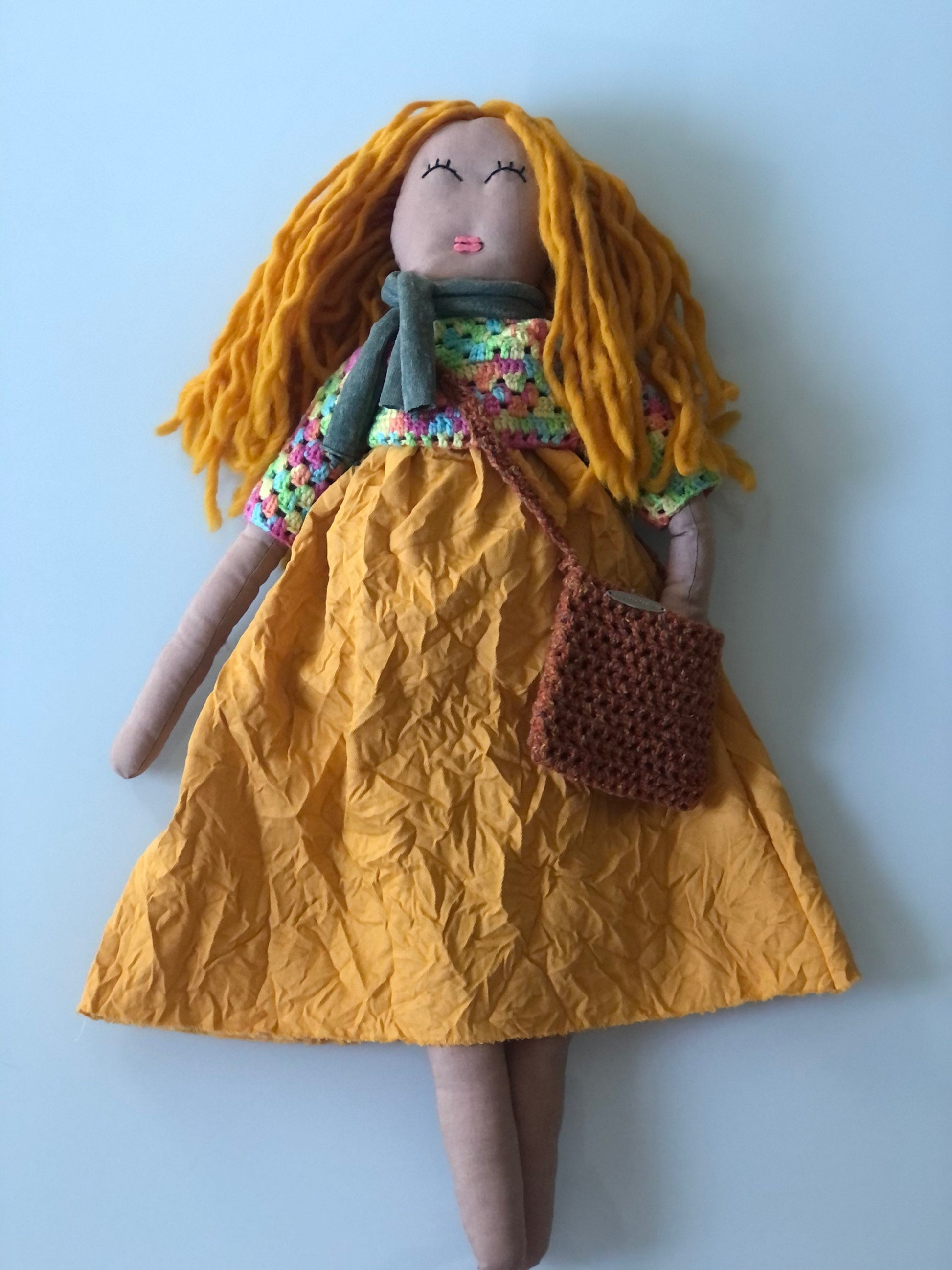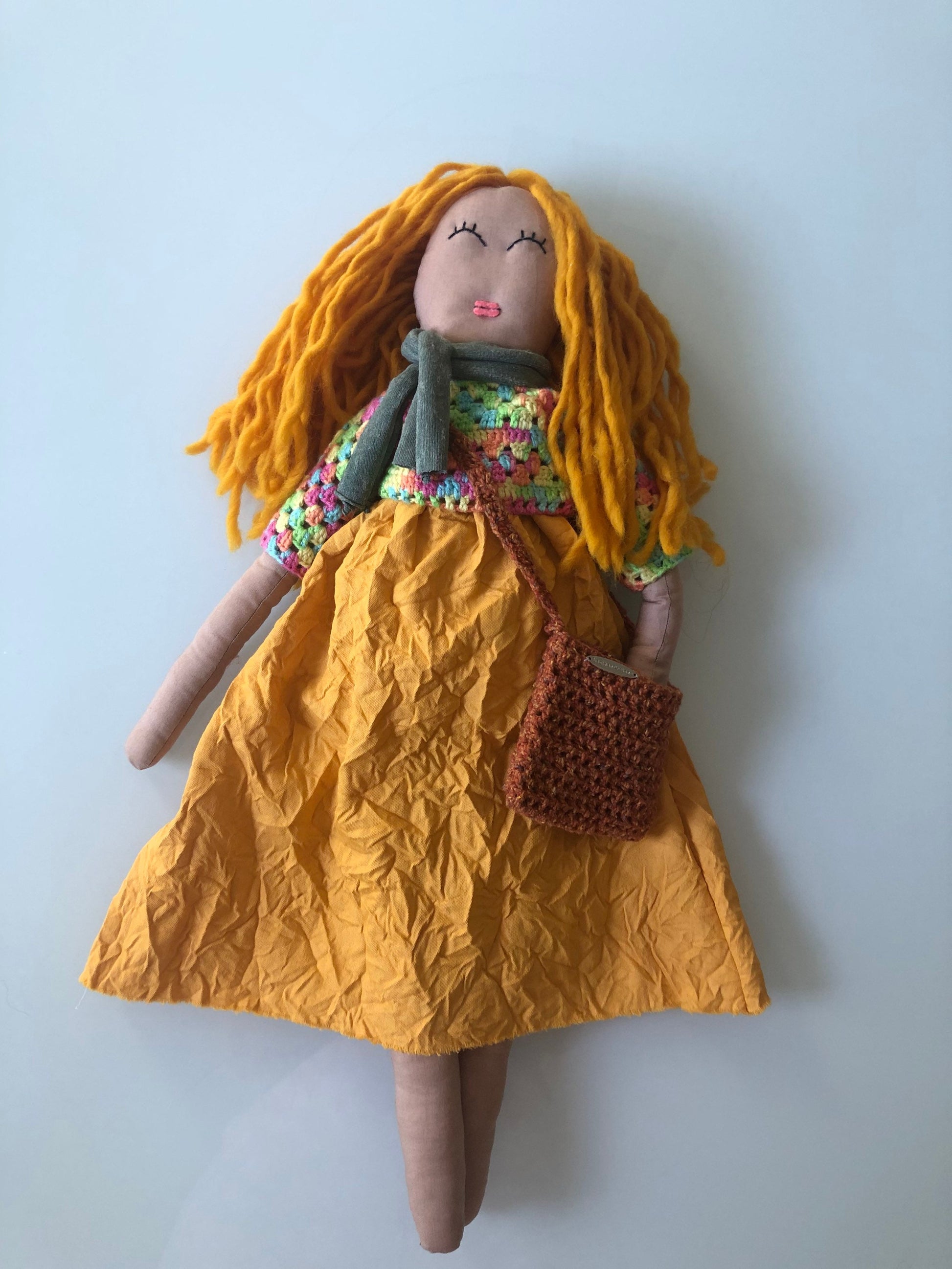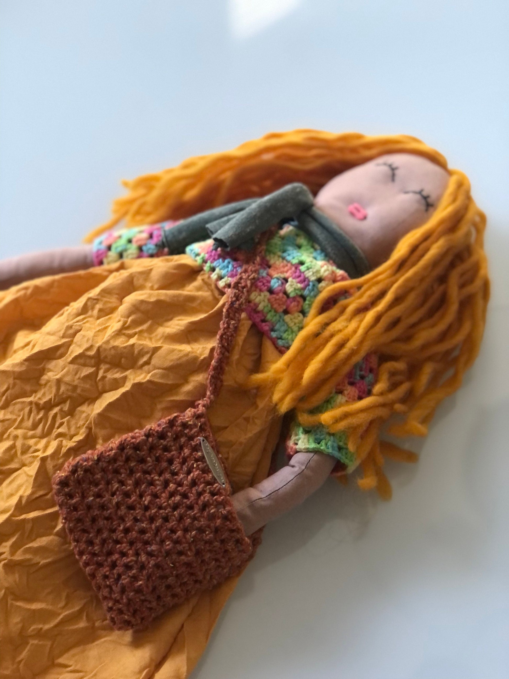 She stands tall and proud at approximately 22 inches tall. Her body is fully 100% cotton fabric, muslin, or linen. She is carefully constructed with her seams double stitched. All materials used in her construction have been carefully sourced and selected from the best and the finest. Her eyes have been free-hand embroidered, which gives every twinkle in every doll's eyes an individual uniqueness. Each doll is stuffed with sustainable corn fiber stuffing. Her hair is mostly 100% wool, cotton, mohair, or acrylic mix yarn. Her arms are attached with handmade crochet motifs, therefore making her arms buttonless jointed. She is recommended as an heirloom doll, for gentle play only for children over the age of three with adult supervision due to the inclusion of small parts. Most importantly, she comes filled with lots of love and joy!